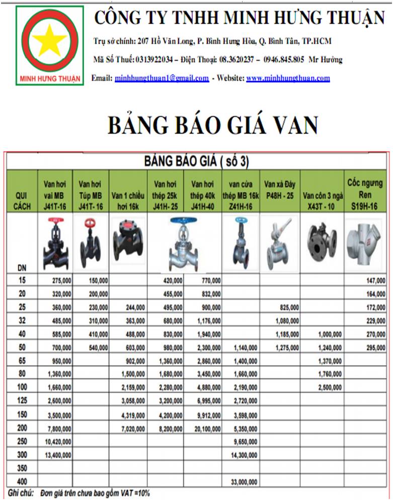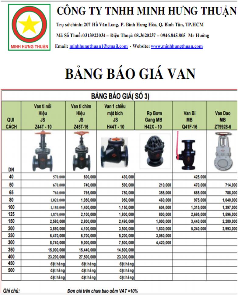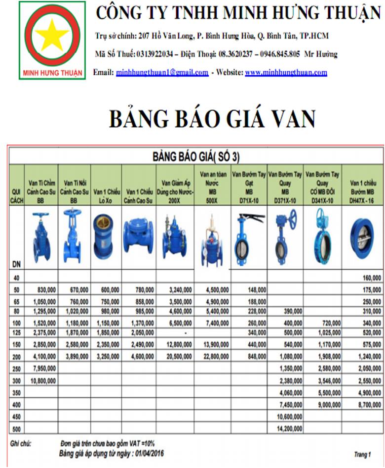 Nhấn theo line sau để tải Bảng Giá đầy đủ của các loại van (Van cửa mặt bích, Van bướm tay gạt, Van bướm tay quay, Y Lọc, Van 1 Chiều,.... ). Line: /upload/files/Bang%20Gia%20Van%20Trung%20Quoc%20Cac%20Loai.pdf