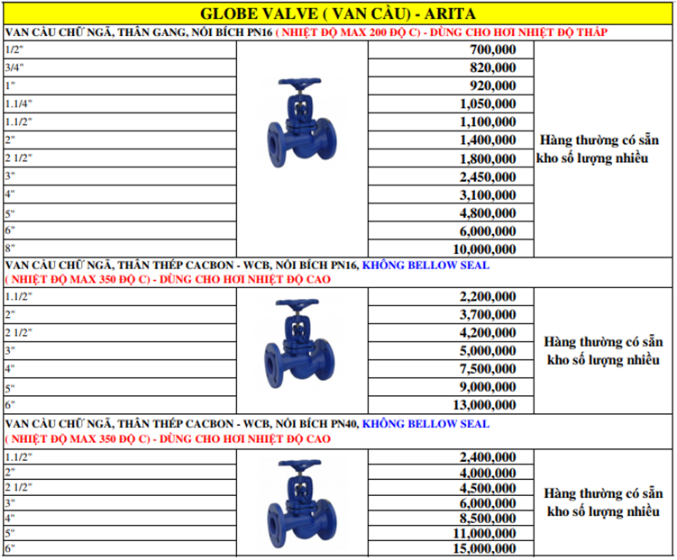 CÔNG TY TNHH SX KD & XNK MINH HƯNG THUẬN XIN GỬI ĐẾN QUÝ KHÁCH HÀNG BẢNG GIÁ Van Cầu Chữ Ngã Nối Bích PN16 PN25 PN40 ARITA NHƯ SAU: